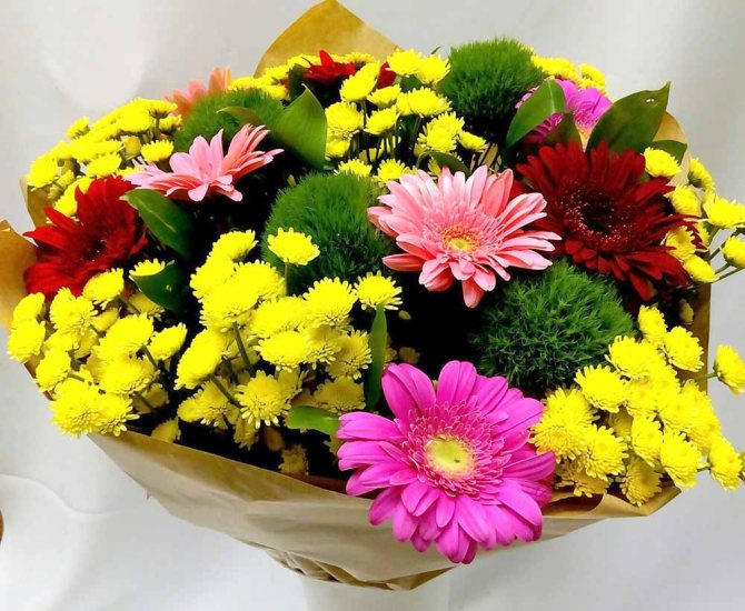 - Герберы. Многоцветный «родственник» хризантем отлично сочетается с императорским цветком. Из-за пышных лепестков герберы и хризантемы являются дополнением друг друга. При сочетании сочных оттенков такой букет подарит яркое впечатление;