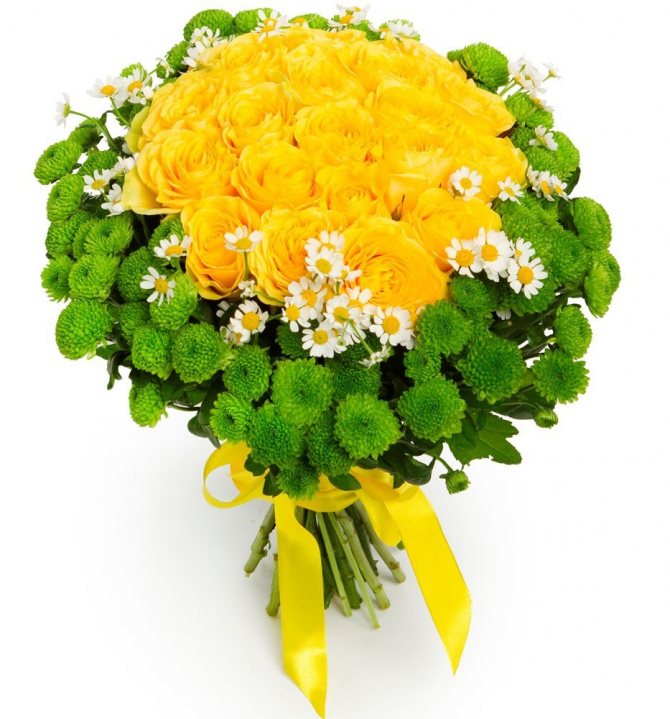 - Розы. Несмотря на то, что роза признана королевой цветов, в сочетании с хризантемой нужно быть очень аккуратными. Только правильно подобранные тона астроцветных могут придать букету особый шарм. Идеальное сочетание желтого и зеленого на фото ниже не делают композицию полной. А вот веселые ромашки дарят букету ноту завершенности. Это же касается и яркой алой розы, ее украсят белые, желтые хризантемы;
