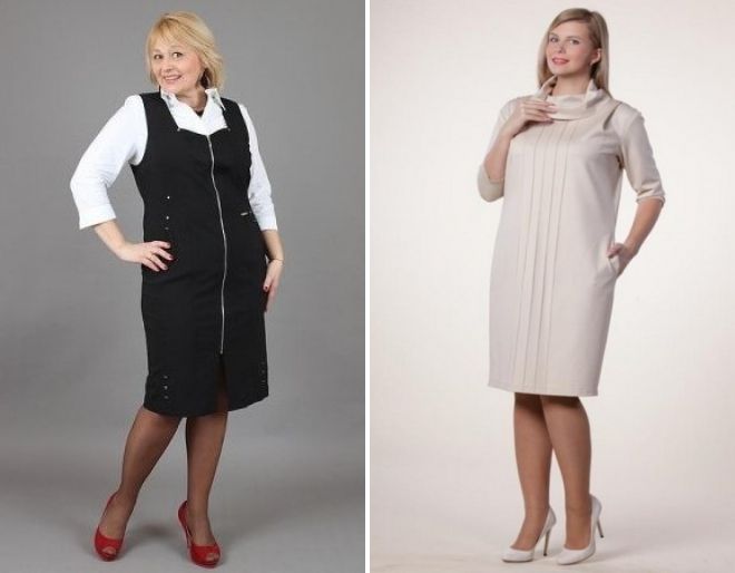 Неплохо смотрится фасон с запахом и вертикальными полосами, однотонный футляр, чуть приталенные варианты.