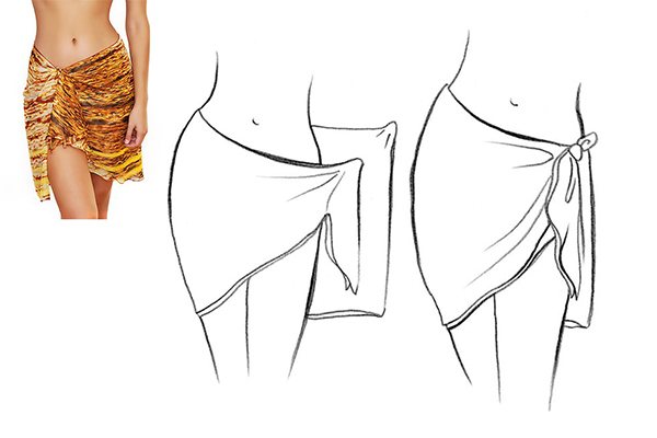 Парео-юбка, который завязывается классическим узлом на бёдрах. Узел можно основать как в области пупка, так и на боку. Быстрая конструкция позволяет чувствовать себя комфортнее, при этом чувство уверенности дает свободу движениям. Стилисты предлагают использовать два платка, для еще более комфортного пребывания на пляже.
