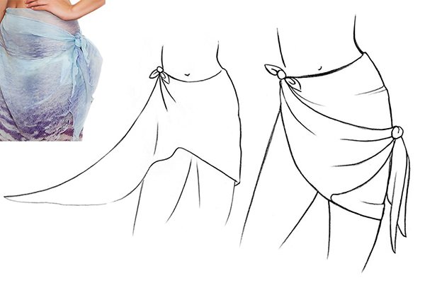 - Наилучший вариант завязывания для скрытия живота — по диагонали. Маленькую грудь визуально увеличивают с помощью плотных парео, завязанных в области груди.
