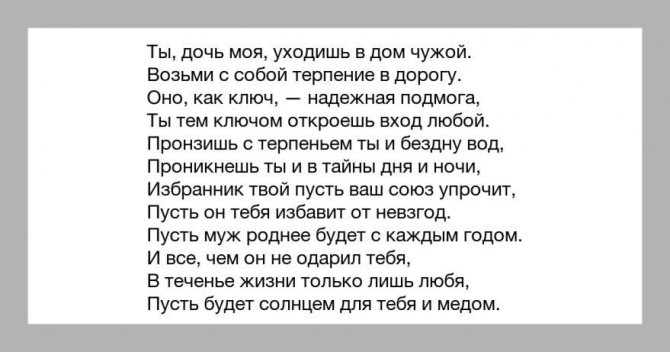 Нашу дочь отдаём мы родную В жизнь большую, в другую семью. Сердце матери нежно тоскует, И отец нервно прячет слезу. Мы тебе, дочка, счастья большого Пожелаем и крепкой любви. К нам под благословенье святое С женихом ты скорей подходи.