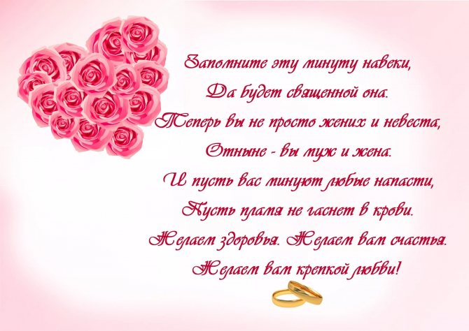 Дорогие дети! Мы желаем вам только всего лучшего: радости, счастья, любви и очень хотим, чтобы ваша семейная жизнь была легкой, словно пух, ровной, будто ободок кольца, который вы надели друг другу на руку. Тебе (имя невесты) мы желаем стать заботливой женой, хорошей подругой, помогай своему супругу советом да добрым словом. Тебе (имя жениха) желаем стать главой семьи, надежной опорой, чтобы твоя жена была за тобой, будто за каменной стеной. Совет вам да любовь!