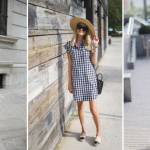 - платье или сарафан в мелкую клетку в комплекте с босоножками на квадратном каблуке.
