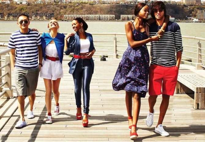 Несомненно, самым узнаваемым предметов, несущим на себе отпечаток соленых брызг и шепота волн можно назвать тельняшку, которая чаще всего находит свое место в современных образах стиля marine. Она чаще всего комбинируется с облегающими узкими джинсами, классическими брюками темно-синего или черного оттенка, с юбкой или шортами. Также не менее узнаваема и популярна матроска, которая дошла до наших дней в практически неизменном виде. Это форменная блуза матроса, характерной чертой которой является большой квадратной формы отложной воротник, который так и стал называться – матросским. Но только этими двумя предметами гардероб морского стиля не заканчивается. Практически каждый предмет платяного шкафа может быть выполнен в стиле marine или сочетаться с ним.