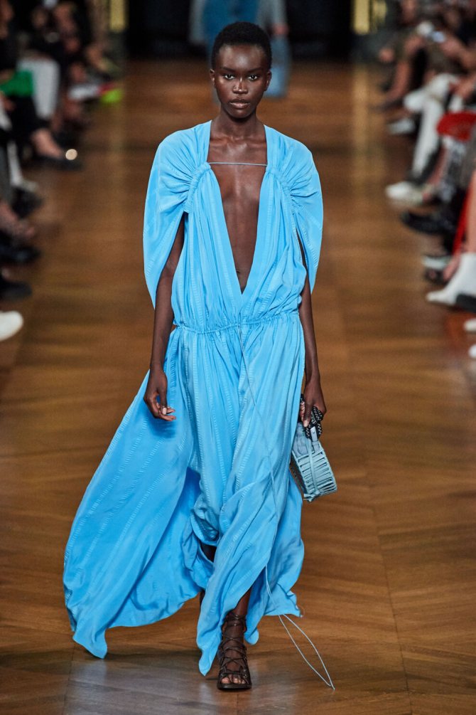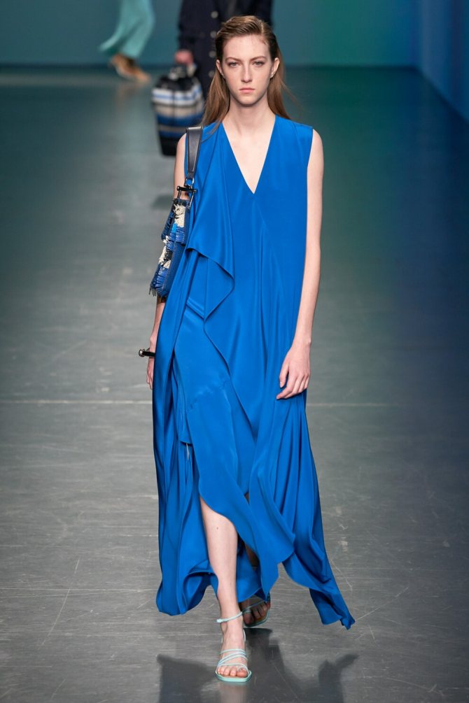 Синяя цветовая палитра и легкие струящиеся ткани традиционно вызывают ассоциации с морским сезоном. Так, в коллекции Alberta Ferretti представлены образы из нежного шифона в глубоком синем оттенке, которые подойдут для вечерних выходов, у Boss можно встретить асимметричное платье для повседневных встреч, а у Stella Mccartney воздушное платье со смелым декольте в оттенке морской лазури.
