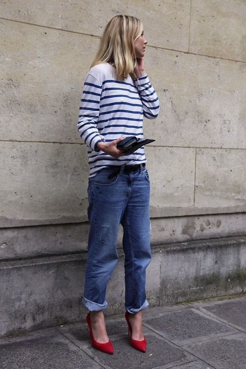 Также уместны джинсы всех оттенков синего цвета, иногда с потертостями или дырами, показательно небрежные. Платья в морском стиле обычно бывают короткими. Однако, в последнее время стали модными длинные в пол сарафаны в морском стиле.