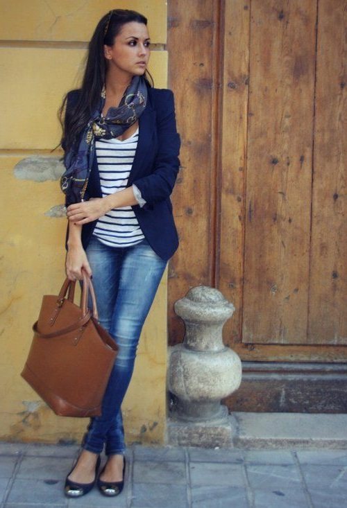 Составить достойный «морской» ансамбль в прохладные дни поможет элегантный укороченный блейзер или пальто. Пример безупречного стиля – темно-синяя приталенная модель до середины бедра с двумя рядами металлических пуговиц (желательно золотых), напоминающая адмиральский мундир. Особый шик такому пальто придадут белая окантовка по воротнику и манжетам и горизонтальная полоска на талии и рукавах.