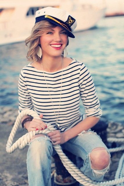 Безупречный образ в морском стиле невозможен без аксессуаров. Достаточно дополнить ансамбль белой капитанской фуражкой или кокетливой шляпкой-бескозыркой – и восхищенные взгляды обеспечены! Кроме того, белые, синие и красные классические сумки и шейные платки с морской символикой, полосатые ремни и браслеты, подвески и серьги в виде якорей, штурвалов или морских раковин наверняка вызовут желание совершить прогулку на яхте во время отпуска и даже попробовать себя в парусном спорте! То, что правильно подобранная одежда создает позитивное настроение – ни для кого не секрет. Именно поэтому чистые цвета, изумительные силуэты и качественные ткани, характерные для морского стиля позволяют ощущать себя свежей, полной сил — и готовой к новым приключениям!