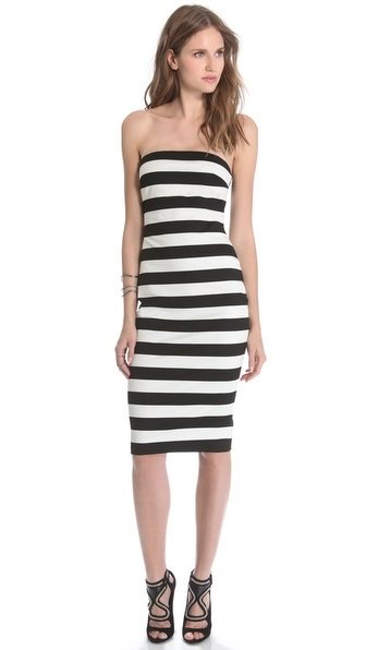 • Открытое белое платье в синюю или черную полоску без бретелей с юбкой до колена;