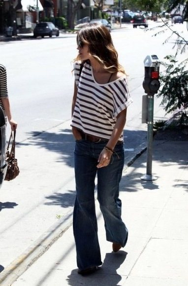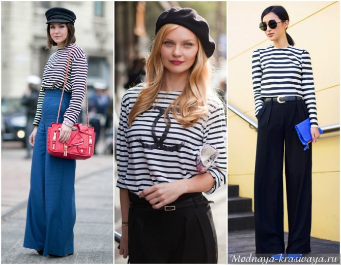 Полосы являются характерной чертой еще одного элемента морского стиля – тельняшки. И тельняшки, и матроски могут быть с длинным или коротким рукавом, не иметь его вовсе или даже быть скроенными наподобие майки. Изящно выглядят джемпера в полоску и блузы «летучая мышь».
