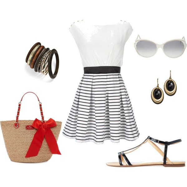 • Двухцветное платье с облегающим белым верхом и полосатой широкой юбкой;