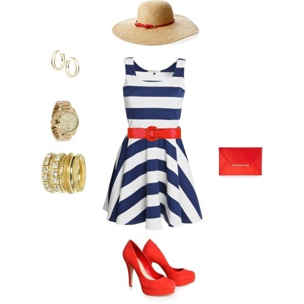 Сегодня наметилась тенденция к красной горизонтальной полоске или окантовке – с такой отделкой платья смотрятся очень нарядно. Однако в этом случае желателен и морской мотив в отделке: вышивка с эмблемой яхт-клуба или флотской символикой.