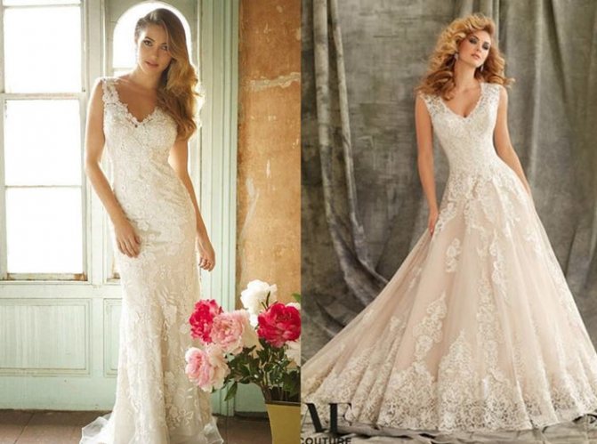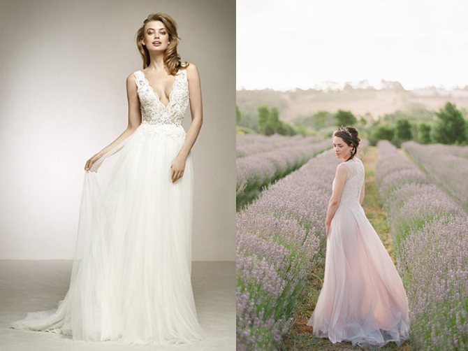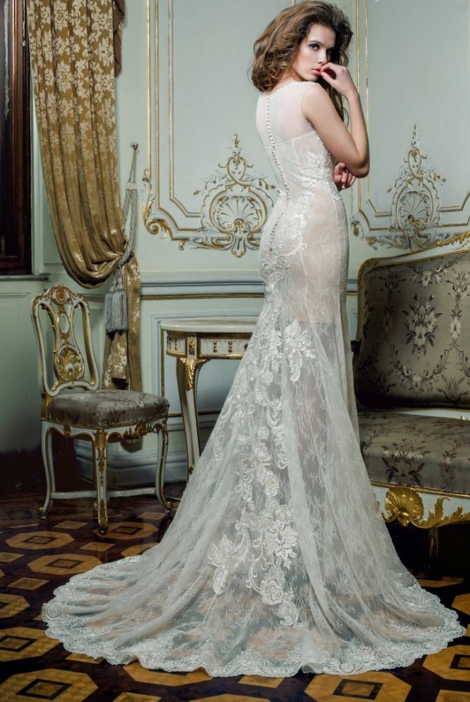 Прямая модель, сшитая полностью из кружевного полотна, украшена гладкой прозрачной верхней юбкой. Она идет от тонкого пояса на талии. Спереди верхняя юбка не сшита, оставлен глубокий разрез от пояса. Сзади образуется красивый невесомый шлейф. Представлены в коллекции модели с открытой спиной, декольтированные или с прозрачными длинными рукавами.