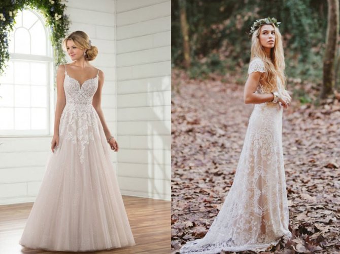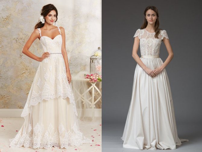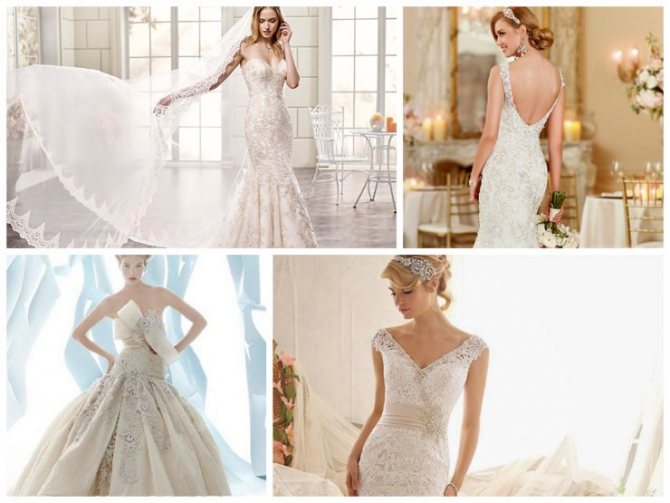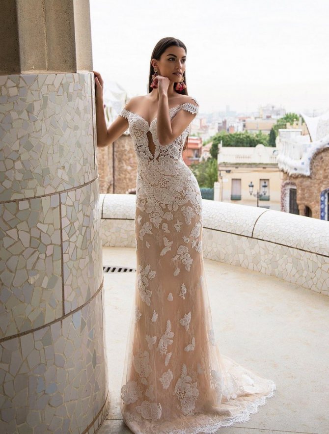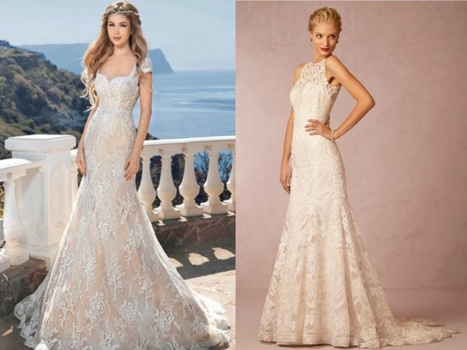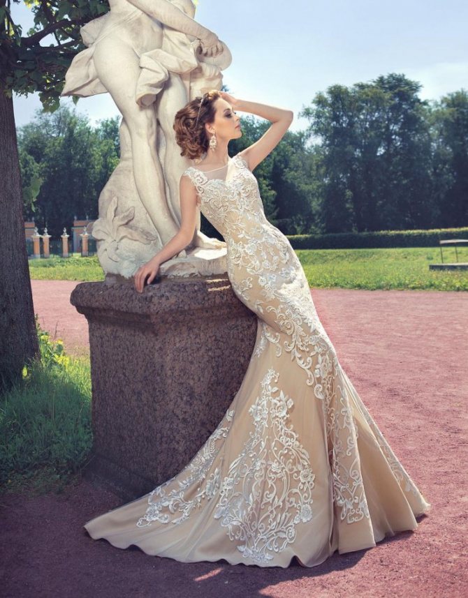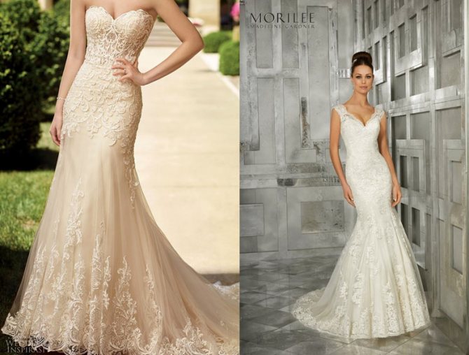 Королевский цвет слоновой кости не выходит из моды. В последних коллекциях много нарядов на свадьбу оттенков айвори. Преобладают платья из гипюра, кружевного полотна. В большинстве своем это фасоны “русалка” с мягкой, ниспадающей юбкой.