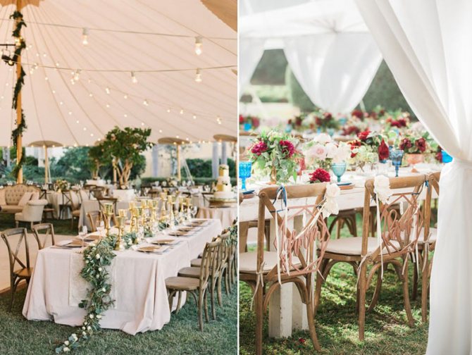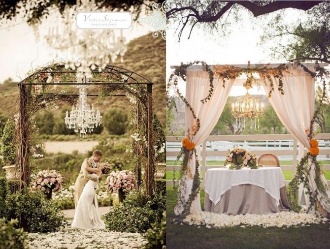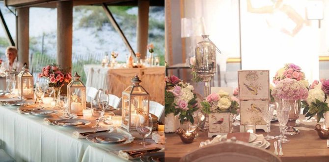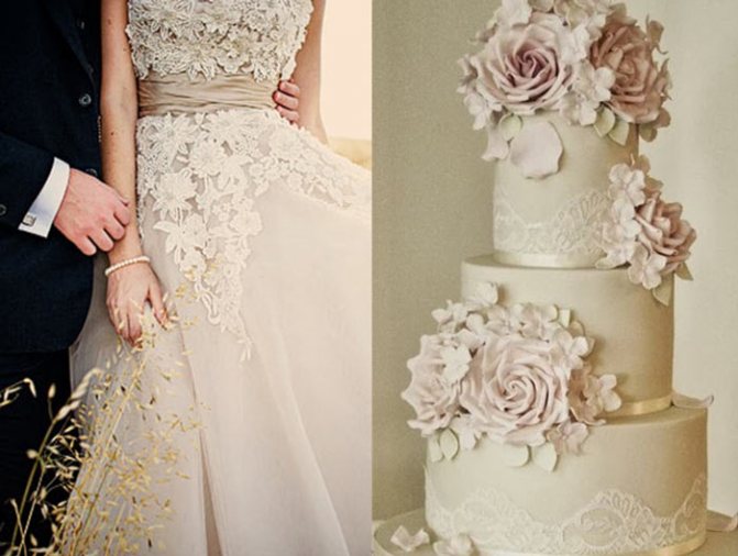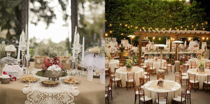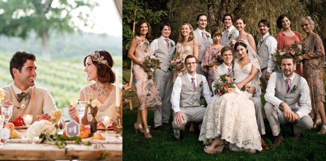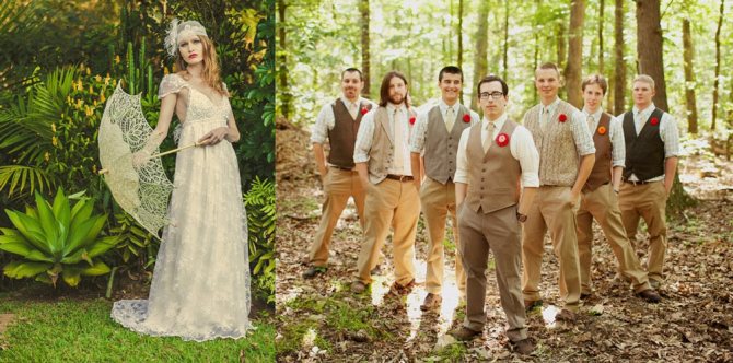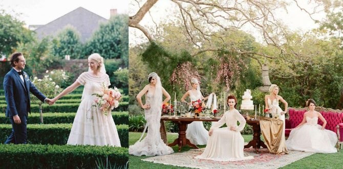 - Винтажная свадьба. Торжество в стиле винтаж – прекрасный выбор для тех, кто хочет отвлечься от повседневной суеты и окунуться в уютную безмятежность недалекого прошлого. В качестве основного цвета для оформления зала подойдут теплые пастельные оттенки цвета айвори. В концепцию стиля винтаж идеально вписывается бежевый цвет свадьбы. Он подойдет для платья невесты, а также для текстильного и флористического декора зала. Завершенность декору придадут винтажные вещи в коричневых тонах натурального дерева. Например, в качестве емкостей для цветочных композиций можно использовать старые деревянные шкатулки. Стиль винтаж предоставляет полную свободу для выбора фасона наряда невесты. Это может быть маленькое коктейльное платье в стиле 30-х годов или пышная юбка-колокол в стиле 50-х. Подойдут также фасоны с облегающим лифом и длинной струящейся юбкой. В качестве дополнения к свадебному наряду подойдет короткая фата цвета айвори, маленькая кокетливая шляпка или шарф с ниспадающими концами, завязанный вокруг головы.