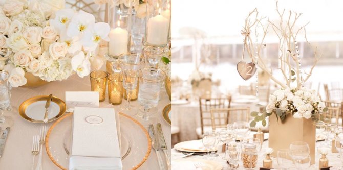 Цвет айвори может стать как главным, так и акцентным тоном в оформлении торжества. Золотистые тона шампанского или нежные кремовые оттенки прекрасно сочетаются со снежно-белым цветом. Поэтому, даже если задумано оформление свадьбы в белом, можно заказать рассадочные карточки айвори и украсить стол цветочными композициями в кремовых тонах.