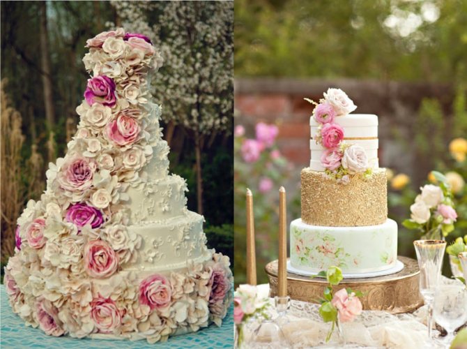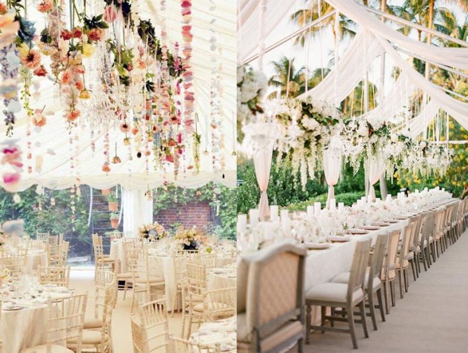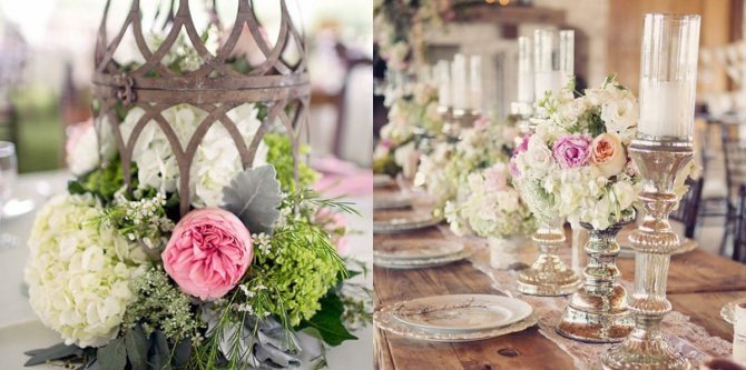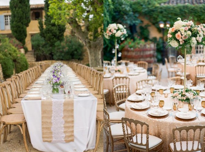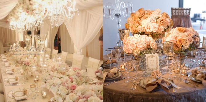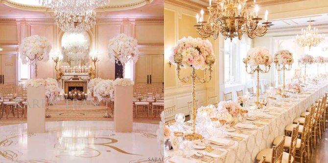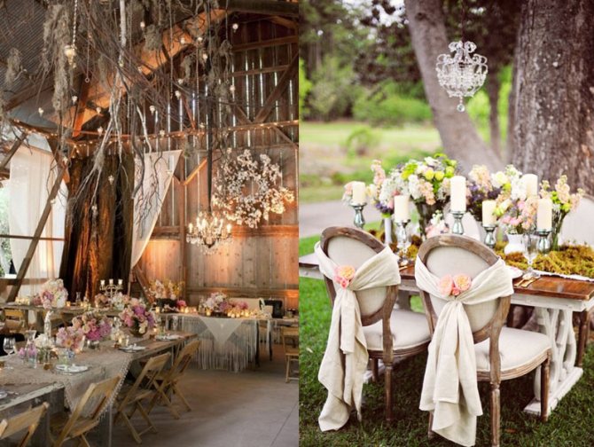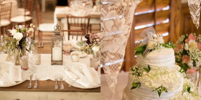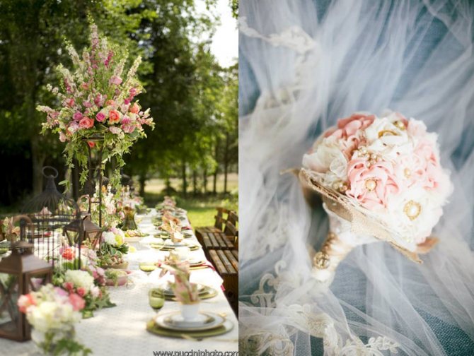 - Шебби-шик. Это стиль предполагает изысканный декор без излишней роскоши и вычурности. В оформлении торжества будут уместны цветочные принты пастельных тонов, атласные банты, кружева, рюши. Свадьба в цвете шампань в стиле шебби-шик впечатлит самую взыскательную публику.
