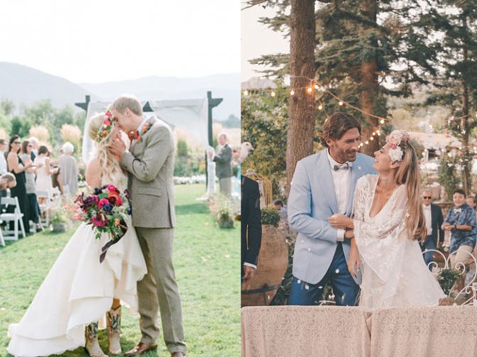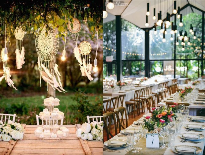 - Богемный шик (бохо). Цвет айвори прекрасно вписывается в концепцию оформления свадьбы в стиле бохо. Эта стилистика объединяет в себе естественность, утонченность и некоторые черты декаданса, ретро, прованса, кантри и даже цыганской эстетики. При выборе подходящего оттенка стоит остановиться на теплых желтоватых или кремовых тонах. Эти цвета гармонично сочетаются и с пастельным, и с ярким декором. При оформлении свадьбы в кремовом цвете будут уместны многоцветные этнические орнаменты или живописные букеты в цыганском стиле, составленные из малиновых, красных, желтых и оранжевых цветов. Свадебное платье цвета слоновой кости хорошо сочетается с белыми и розовыми розами, букетами из полевых цветов, лавандой.