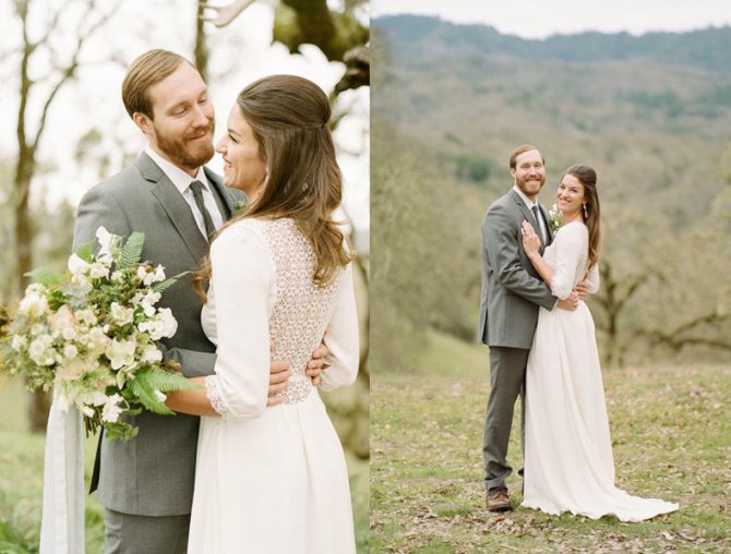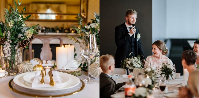 - Скандинавский стиль. Эта стилистика оформления свадеб вошла в моду относительно недавно, но стала очень популярной среди молодых пар. Она характеризуется простой, уютной обстановкой и спокойным пастельным колоритом. Для платья невесты в скандинавском стиле подойдут холодные светлые оттенки. С таким нарядом будет хорошо сочетаться синий костюм жениха и рубашка цвета айвори в тон свадебному платью. Во флористическом декоре, помимо живых цветов, используются такие растительные материалы, как сухоцветы, ветки деревьев.