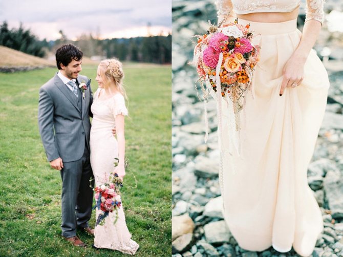 А для невесты в платье коричневого оттенка следует подобрать сложный букет, в котором удачно соединили разные цветы теплой и холодной гаммы.