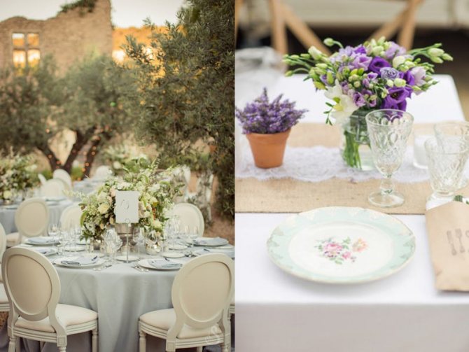 - Стиль прованс. Песочные и бежевые оттенки цвета айвори – прекрасный выбор для оформления свадьбы в стиле прованс. Они хорошо сочетаются с остальной цветовой палитрой этой стилистики: лавандовыми, розовыми, голубыми и оливковыми расцветками. Свадьба в пудровых тонах в стиле прованс – выбор романтических и нежных натур. В оформлении торжества и выборе фасонов нарядов для новобрачных приветствуется максимальная естественность и даже легкая «небрежность». Пиджачную пару не обязательно подбирать в одном цвете. Очень красиво будет выглядеть жених, одетый в черные брюки, лавандовый пиджак и рубашку цвета айвори.