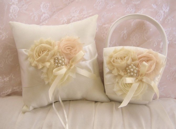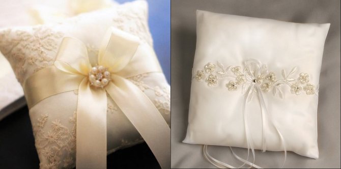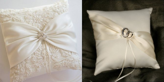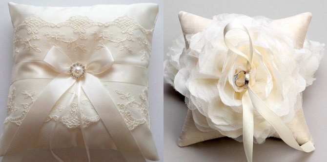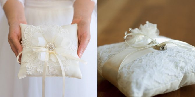 Небольшие, но знаковые аксессуары очень украшают торжество. К ним относится подушечка для колец. Этот нарядный аксессуар используется для того, чтобы поднести кольца молодой паре на выездных церемониях. Как правило, подушечка изготавливается из ткани в тон платью невесты, украшается рюшами, кружевом или стразами.