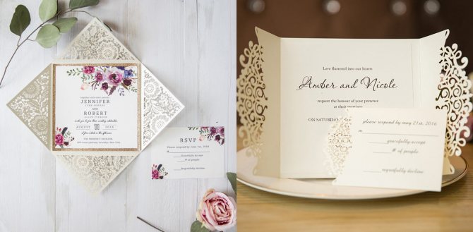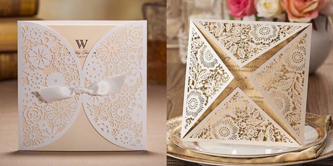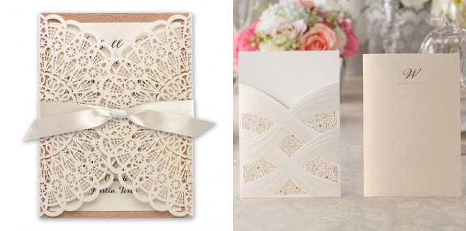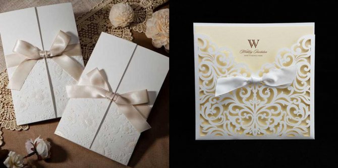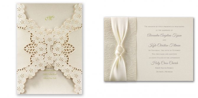 Нарядные приглашения создадут у гостей праздничный настрой задолго до торжества. С бежевыми и кремовыми оттенками хорошо сочетается золотое тиснение в виде тонкой рамки или вензелей, нежный цветочный рисунок. Приглашения ручной работы можно украсить кружевом или атласной лентой.