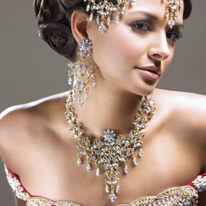 Когда наряд имеет какой-то яркий элемент, например, ленту на талии или бант на асимметричном вырезе лифа, то желательно, чтобы на украшениях были камни таких же оттенков.
