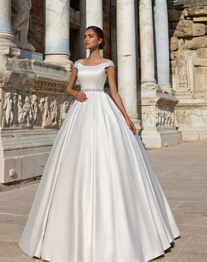 Популярными являются модели более скромных фасонов, но за счет качественного материала, они не кажутся простыми. Элегантно смотрятся платья приталенного силуэта, слегка расширенные внизу. Предусмотрен небольшой шлейф, который является изюминкой всего наряда.