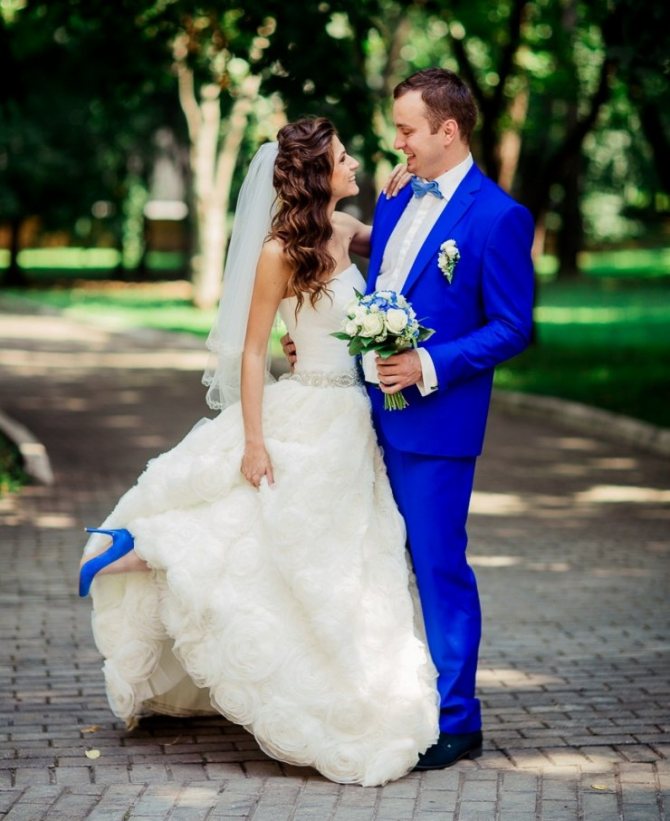 Если молодожены считают оформление всего свадебного торжества в какой-то единой стилистике слишком сложным и хлопотным занятием, то это совершенно не мешает использовать пудровый цвет в традиционной свадебной церемонии. Например, нарядить невесту в платье цвета слоновой кости и в синий костюм с галстуком цвета айвори – жениха. Такое сочетание цветов в свадебных нарядах не будет слишком экстравагантным, но, несомненно, выделит молодоженов в ЗАГСе среди других пар.