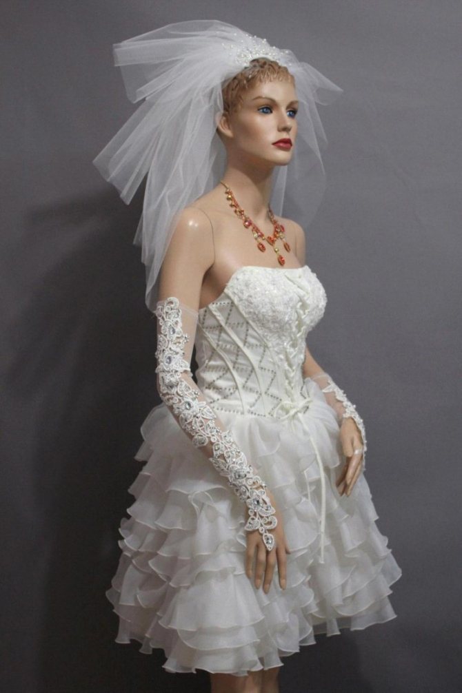 Если торжество пройдет в кругу самых близких и родных, стоит отдать предпочтение удобному платью длиной до колен. Кружевное убранство цвета слоновой кости поистине королевский наряд.