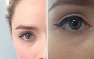 Целью макияжа в этом случае является изменение формы глаза. При прорисовке стрелки ее хвостик уводится наверх от края глаза чуть раньше, чем заканчивается естественный контур. Этот прием позволит развернуть «падающие» уголки. Линию можно нарисовать карандашом или растушевать, но в последнем случае нужно соединить нижнюю полоску с верхней и направить ее по направлению к виску.