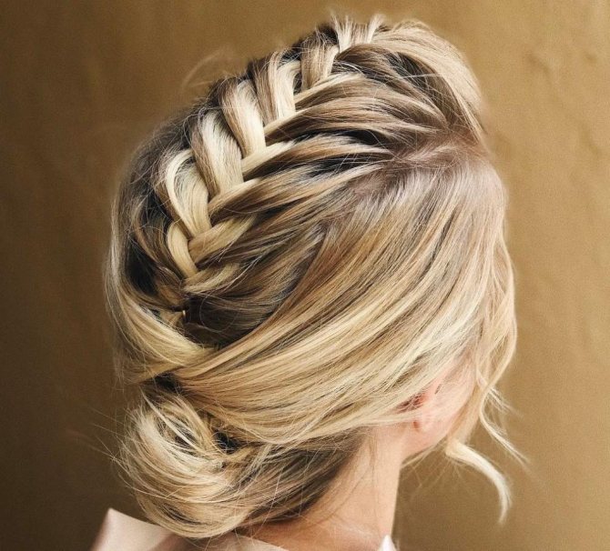 - Продолжать плетение до тех пор, пока не будут вплетены все волосы боковых частей.