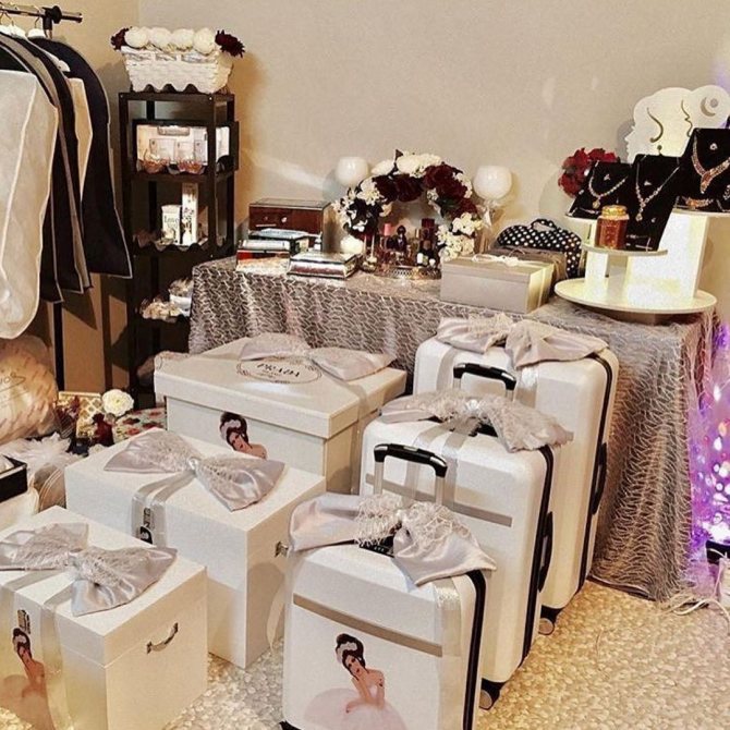 И все это должно быть очень красиво упаковано и сложено, либо в чемоданы, либо это может быть сундук. Каждую вещь нужно упаковывать в отдельный целлофановый пакет. Чтобы при открытии вашего багажа, родственники увидели не стопку вещей, а красивые упаковки с бантами.