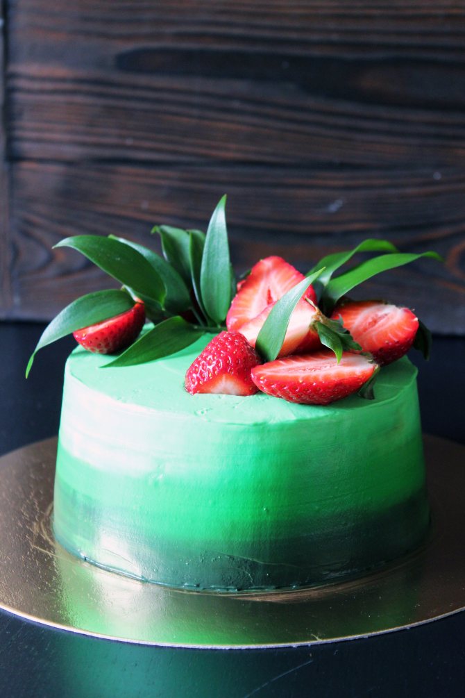 С эффектом омбре может быть не только внешнее оформление, но и коржи. Для этого нужно лишь добавить пищевой краситель к тесту во время замешивания. Пока торт будет в цельном состоянии, такой ход будет незаметен, но после разрезания десерта покажется изюминка оформления.