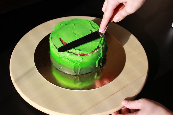 Проходимся шпателем по верхушке торта, разравнивая крем по всей поверхности.