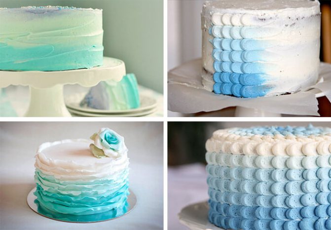 Популярное сегодня создание кондитерских изделий в технике «омбре» является переходом цвета на поверхности торта или десерта от более темного к светлому. Причем технику «омбре» можно сделать не только кремом, получается такой плавный переход и на мастике, глазури, при помощи подтеков. Сам торт можно сделать абсолютно любым, но по традиции используется бисквит, поскольку он оптимален под мастику и украшения масляным и другим кремом. Крем для прослойки бисквитных коржей вы также можете выбрать любой.