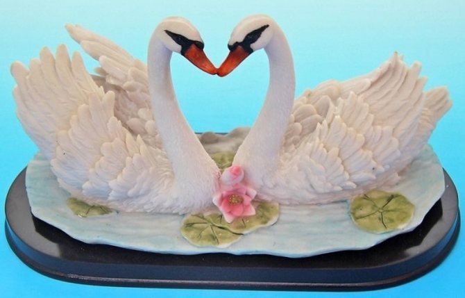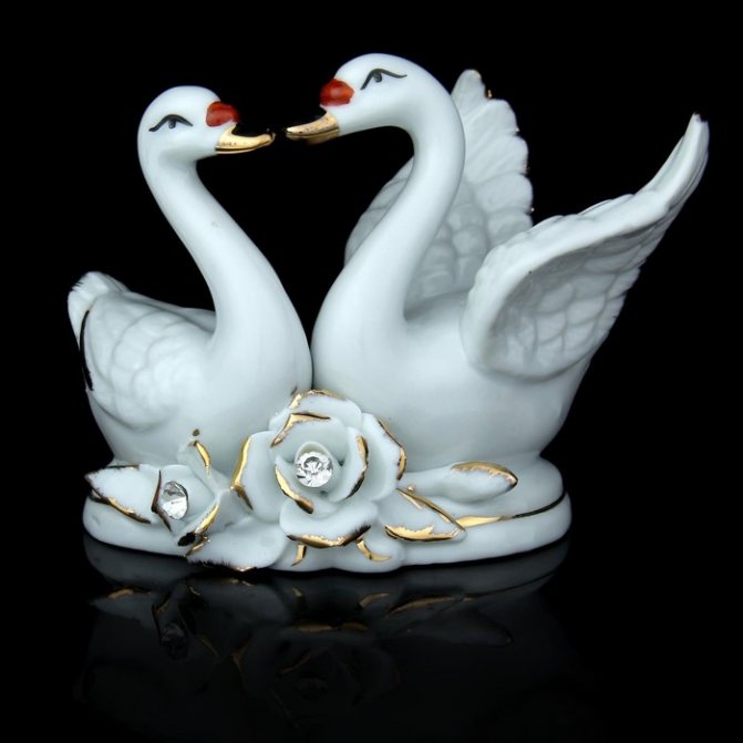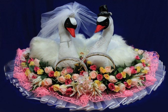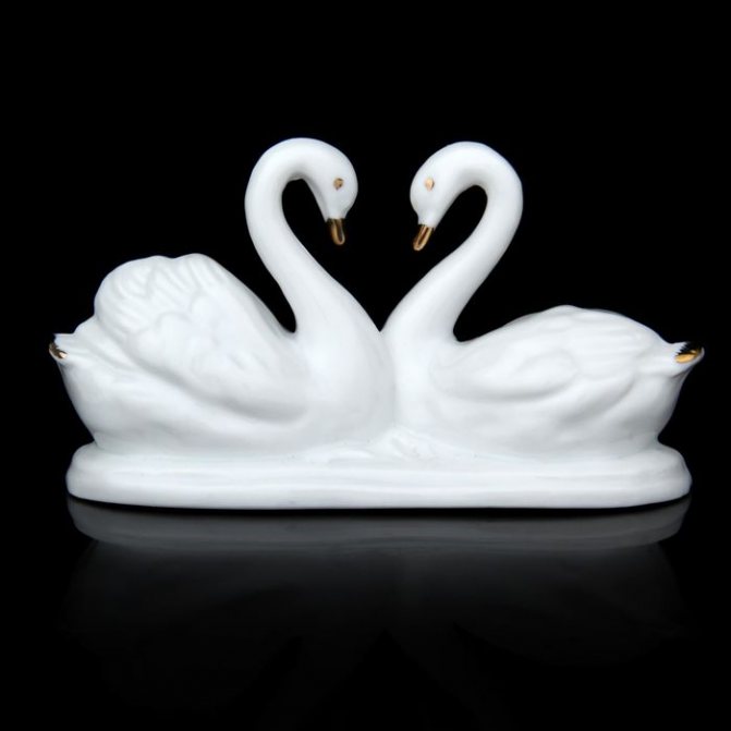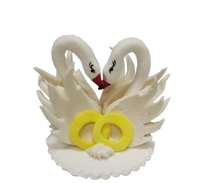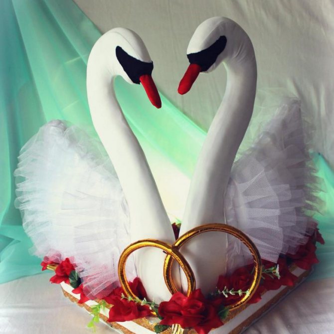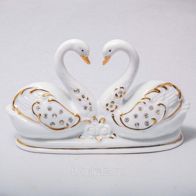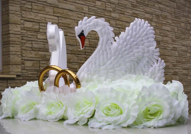 В этом случае на каждый из них устанавливается по одному лебедю, их шеи выгибаются навстречу друг другу, а клювики соприкасаются.