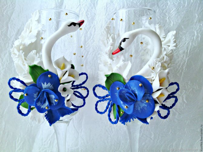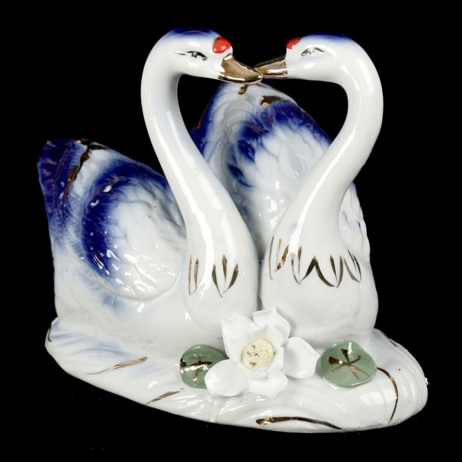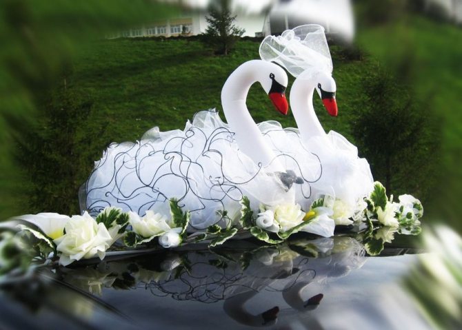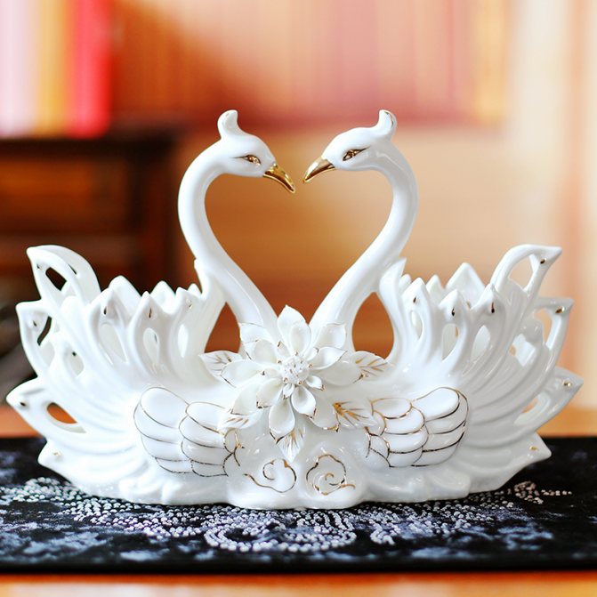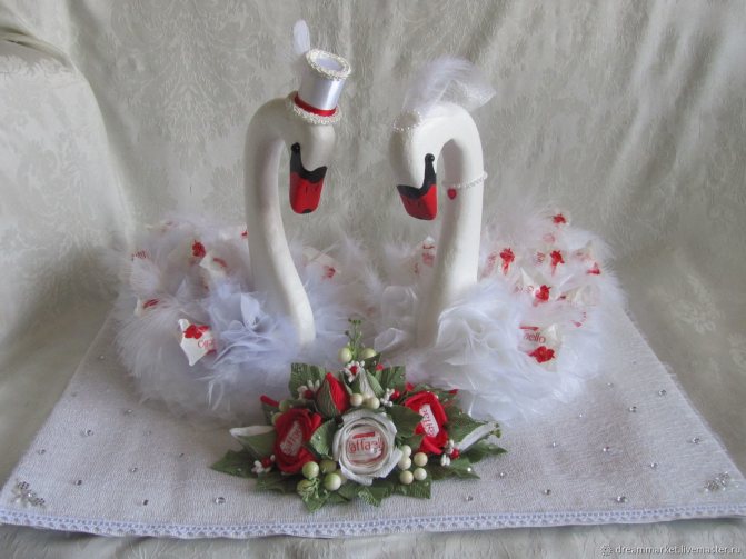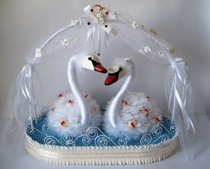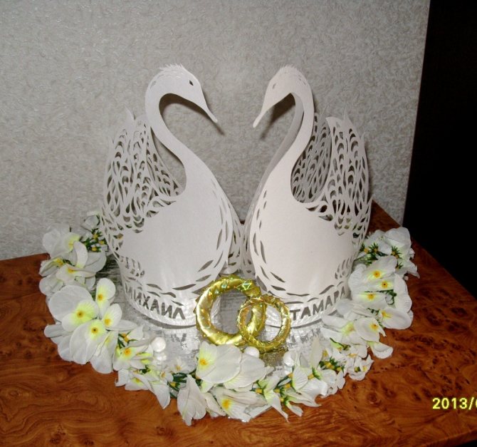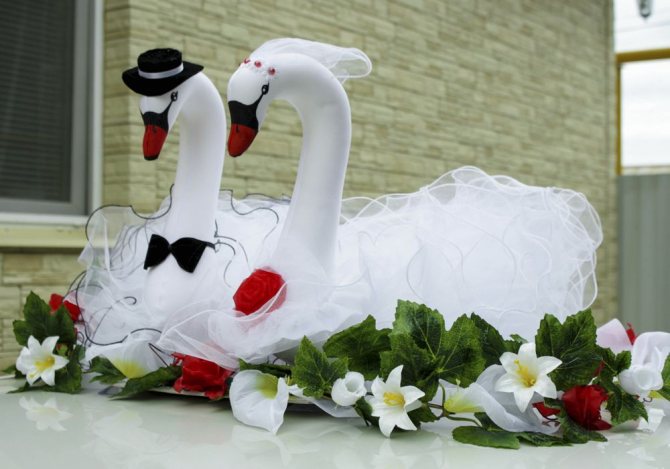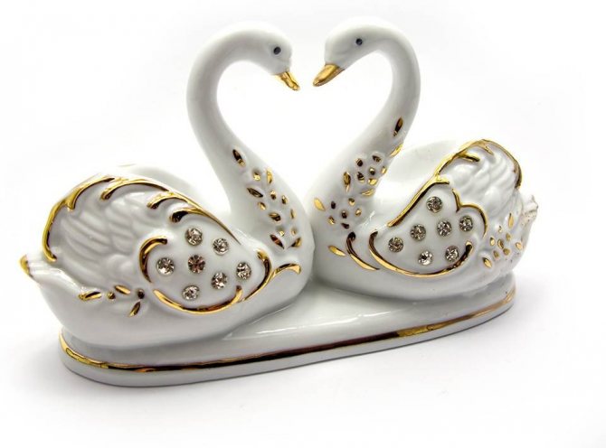 В этом случае на каждый из них устанавливается по одному лебедю, их шеи выгибаются навстречу друг другу, а клювики соприкасаются.