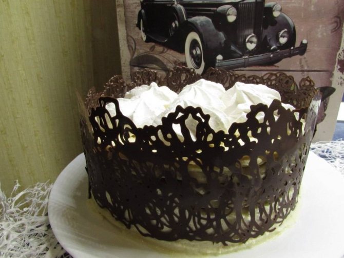 - Ажурные узоры из шоколада потребуют некоторой сноровки. Для их приготовления растопите горькую или белую плитку на пару (оптимально – в СВЧ-печи), переложите массу в кондитерский шприц или мешок.