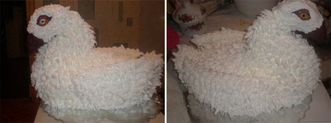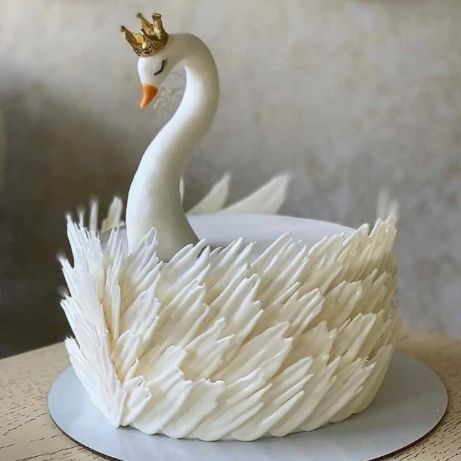 Существуют не только десерты с фигурками лебедей, но и целые торты в форме этих птиц с 3D-эффектом. В этом случае коржи делаются овальными, чтобы была схожесть с туловищем лебедя, а фактуру перьев передают взбитыми сливками. Единственный минус такого торта – шея птицы делается короткой, иначе существует вероятность, что она сломается и испортит все впечатление от десерта.