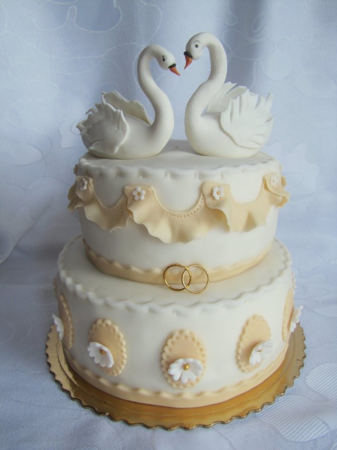 Но главным украшением одноярусного изделия станут белоснежные лебеди и два обручальных кольца, как символ супружеской верности.