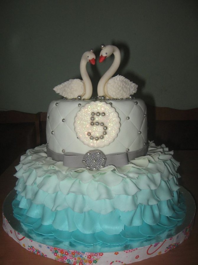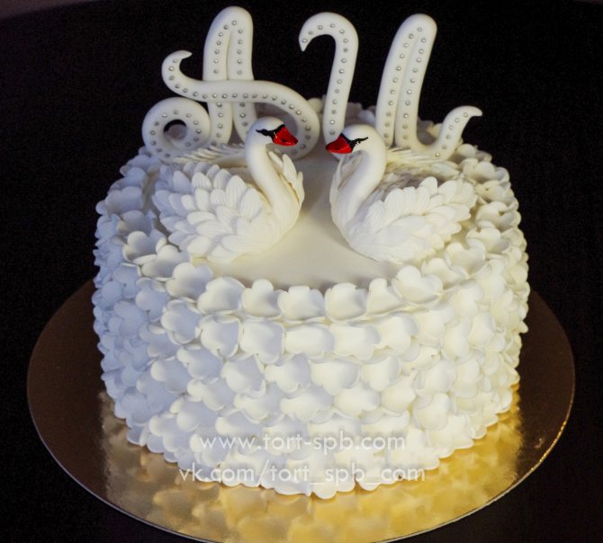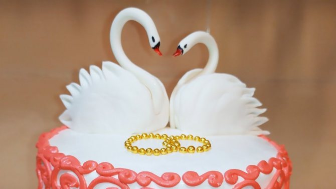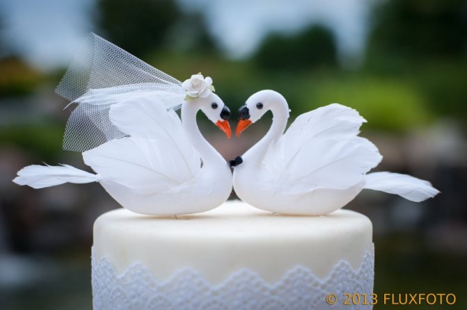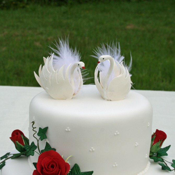 Если вы хотите, чтобы лебеди стали символом вашей семейной жизни, то можете приобрести в магазине фигуры из фарфора. Они будут достойно смотреться на коржах. Поместите их сверху, а после банкета заберите домой.