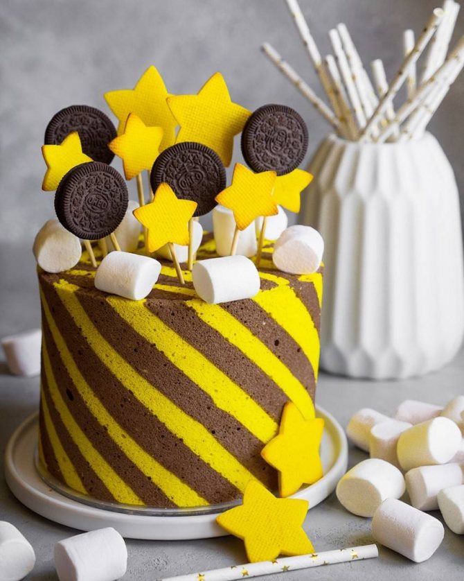 - Боковую поверхность можно украшать длинными батончиками, вафельными трубочками, выстроив их в ряд и перевязав яркой атласной лентой.