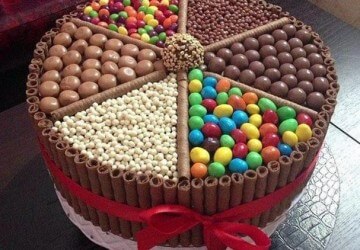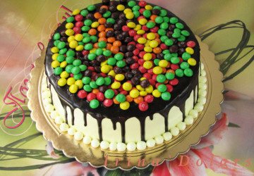 Украсить можно любой торт. Конфеты укладываются на густую и вязкую поверхность: глазурь белую или шоколадную, масляный крем, взбитые сливки: