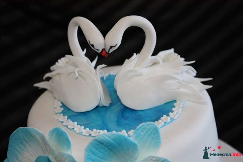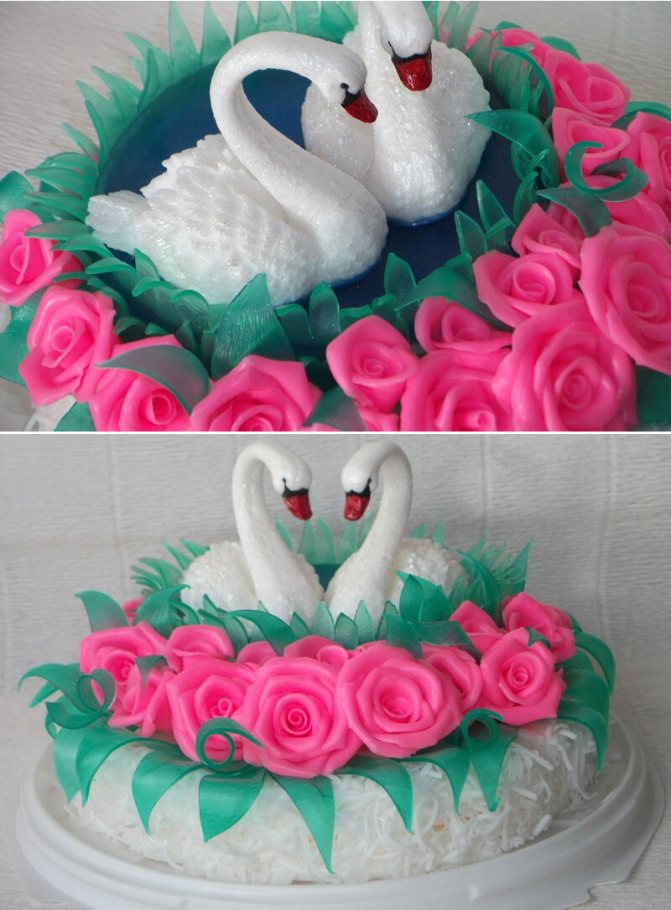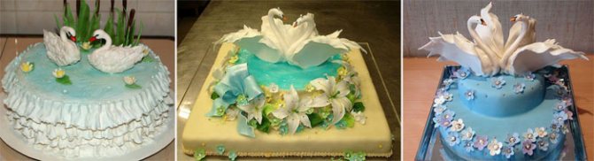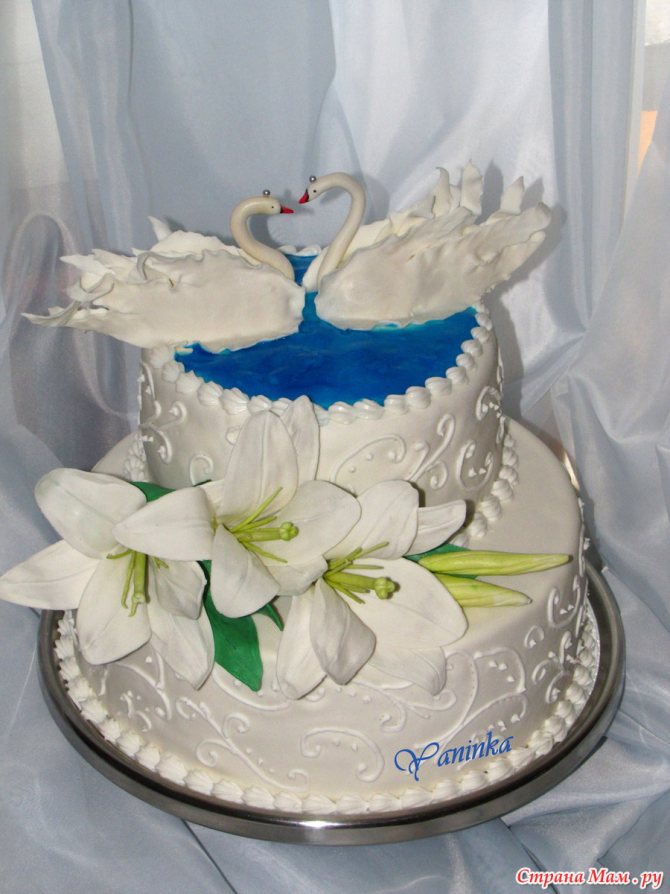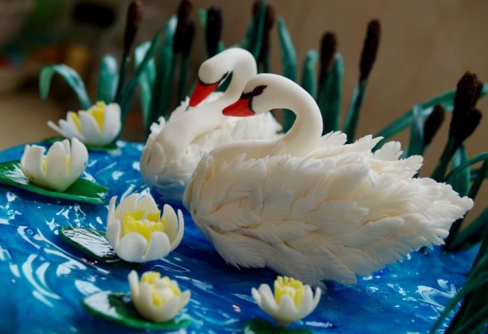 Оформить такой торт можно в виде пруда или водопада, а для украшения используются лилии, розы, пара колец или сердец. Самих лебедей можно приобрести в готовом виде в магазине для кондитеров, причем птицы могут быть как съедобными, так и нет.