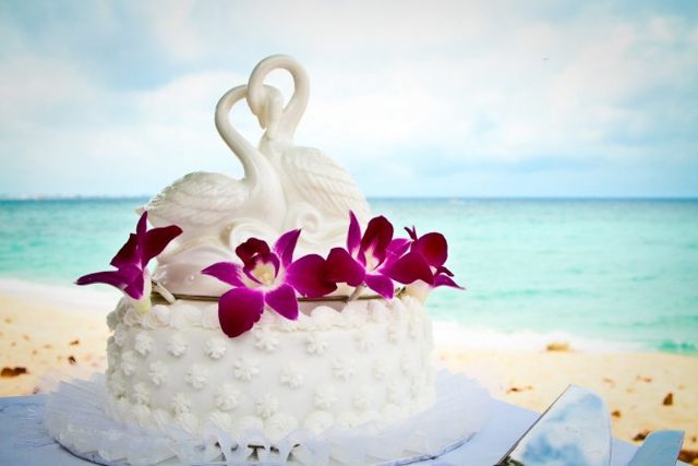 Например, сначала ванильный, затем шоколадный, а сверху персиковый, на котором живописно размещаются сладкие лебеди и шикарные марципановые розы.