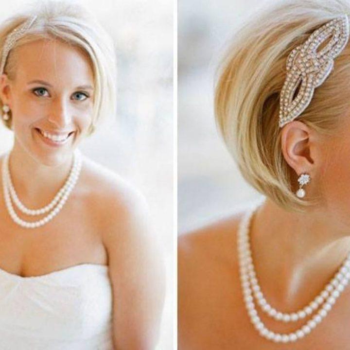Оригинальными считаются свадебные прически на короткие волосы из прямых локонов с наличием прямой челки, выполненные в ретро стилистике. Такая прическа будет похожа на модный в прошлые годы боб. Дополнив эту прическу аксессуарами, к примеру, диадемой, образ невесты будет искриться по-новому.