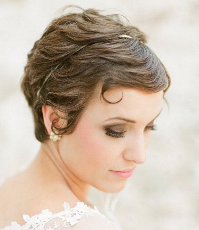 Прическа для свадьбы с короткими волосами позволяет сымитировать эффект «длинных волос», к примеру, если волосы спереди уложить при помощи фиксирующего геля назад, а сзади прикрыть фатой. Такая укладка возможна лишь при наличии хорошего средства для фиксации волос.